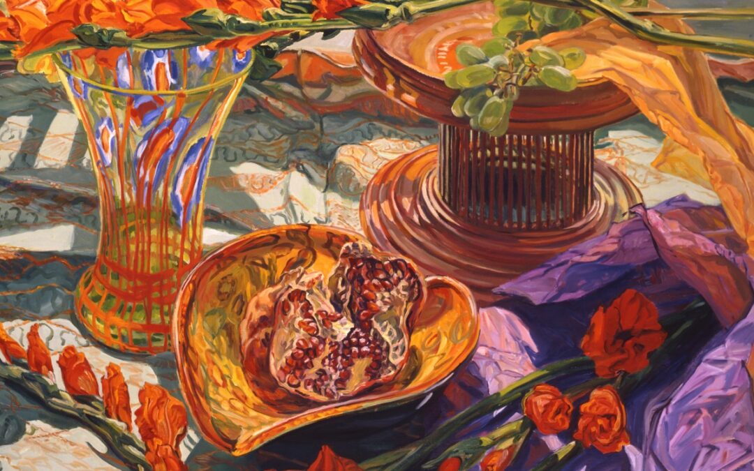 Janet Fish, Pomegranate and Gladioli (detail), 2006, oil on canvas, 50 x 56 in.